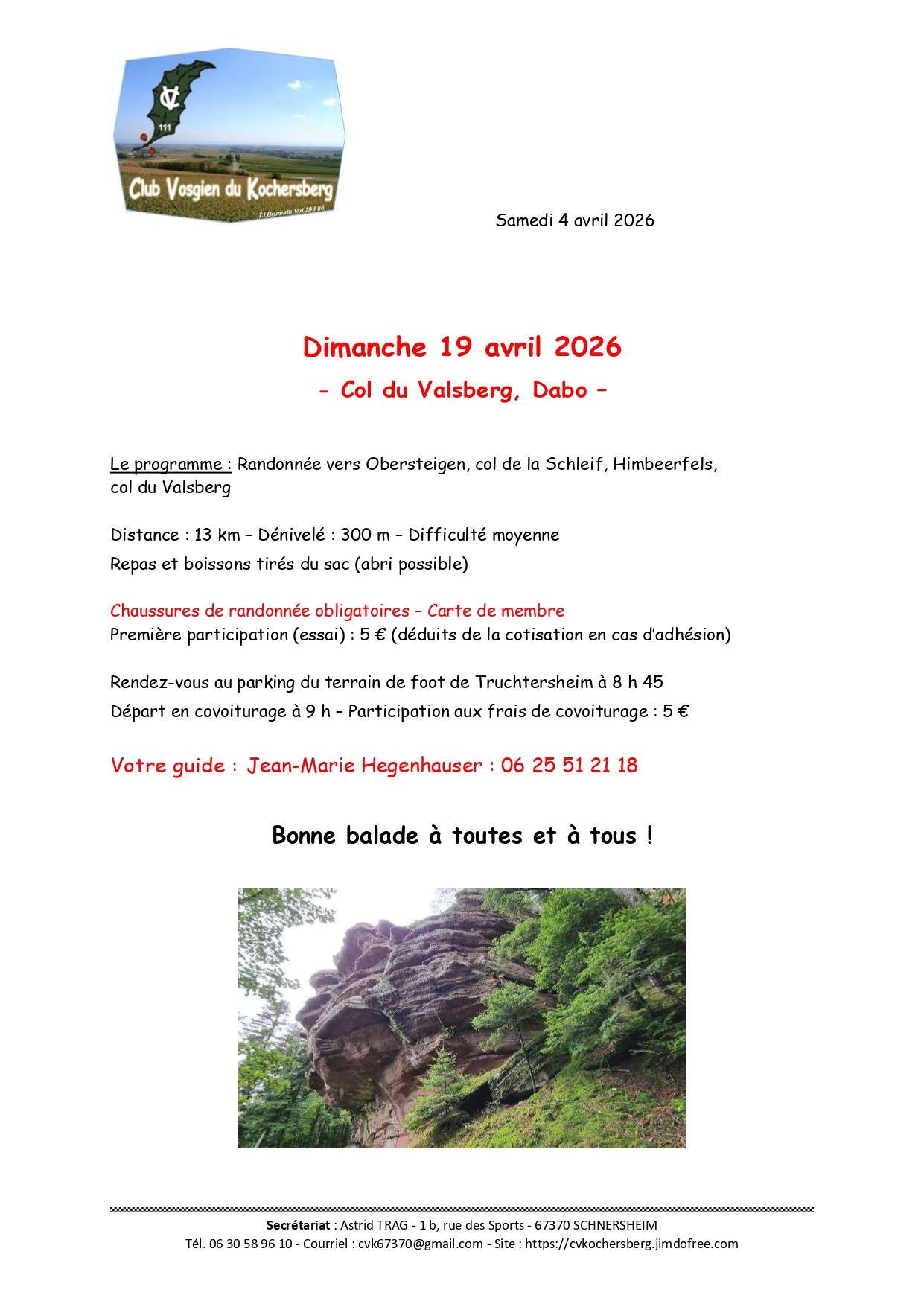 Le dimanche 19 avril 2026, le Club Vosgien du Kochersberg organise une randonnée : Col du Valsberg, Dabo – Le programme : randonnée vers Obersteigen, col de la Schleif, Himbeerfels, col du Valsberg.