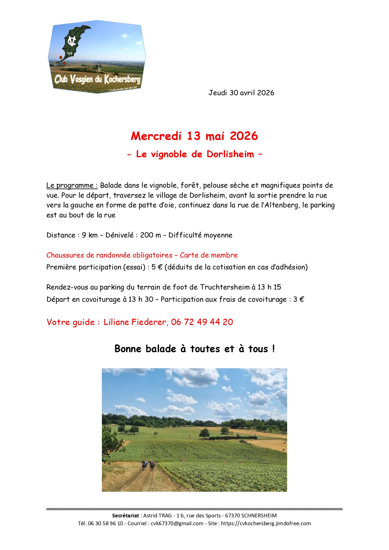 Le mercredi 13 mai 2026, le Club Vosgien du Kochersberg vous propose une randonnée : Le vignoble de Dorlisheim – Le programme : Balade dans le vignoble, forêt, pelouse sèche et magnifiques points de vue. Pour le départ, traversez le village de Dorlisheim, avant la sortie prendre la rue vers la gauche en forme de patte d’oie, continuez dans la rue de l’Altenberg, le parking est au bout de la rue.