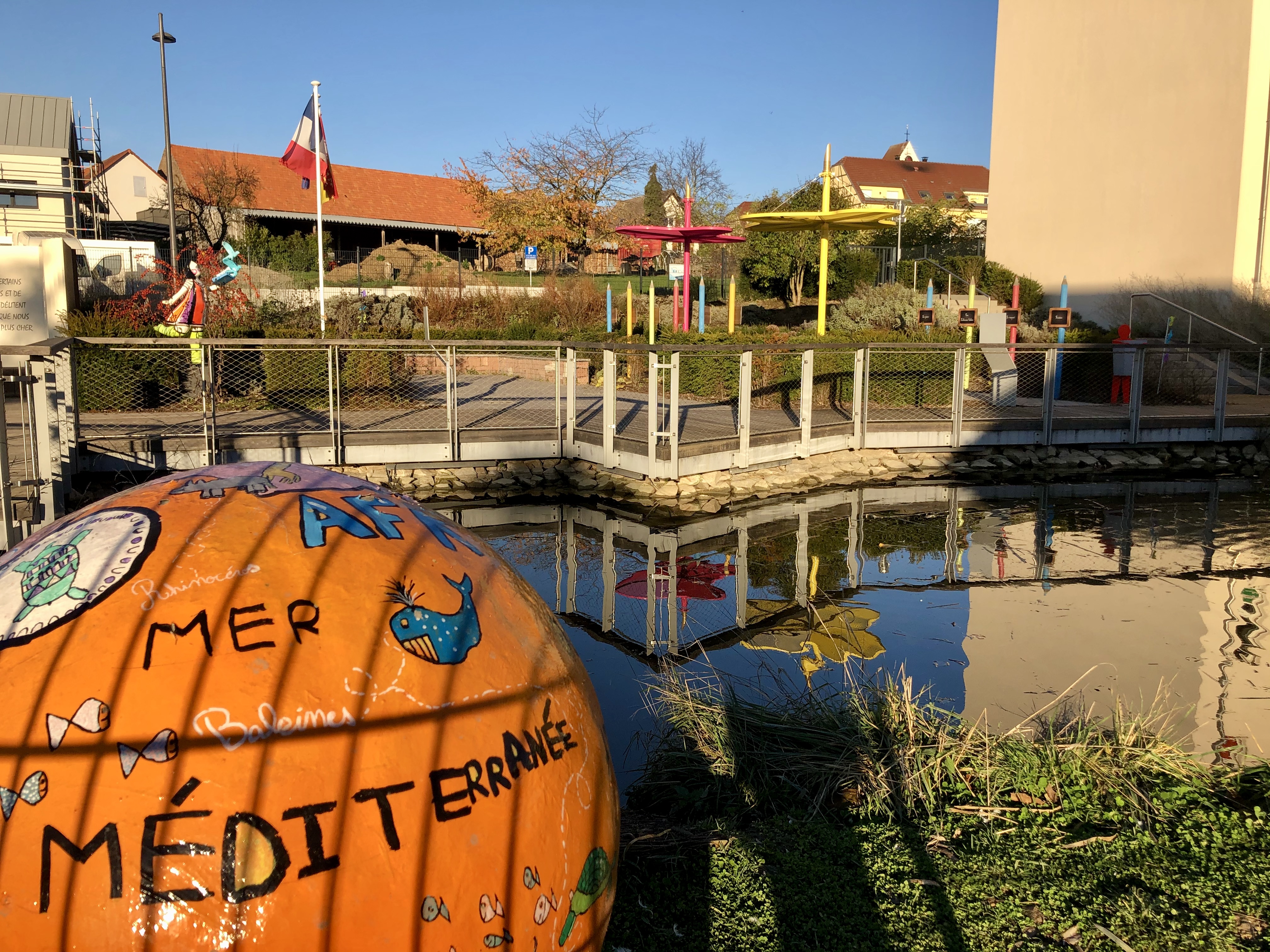 Par ailleurs, et afin d’agrémenter artistiquement ce jardin, 5 sphères représentant chacune un continent sont installées autour de l’étang, comme autant d’opportunités pour les enseignants d’aborder la géographie et la diversité.
