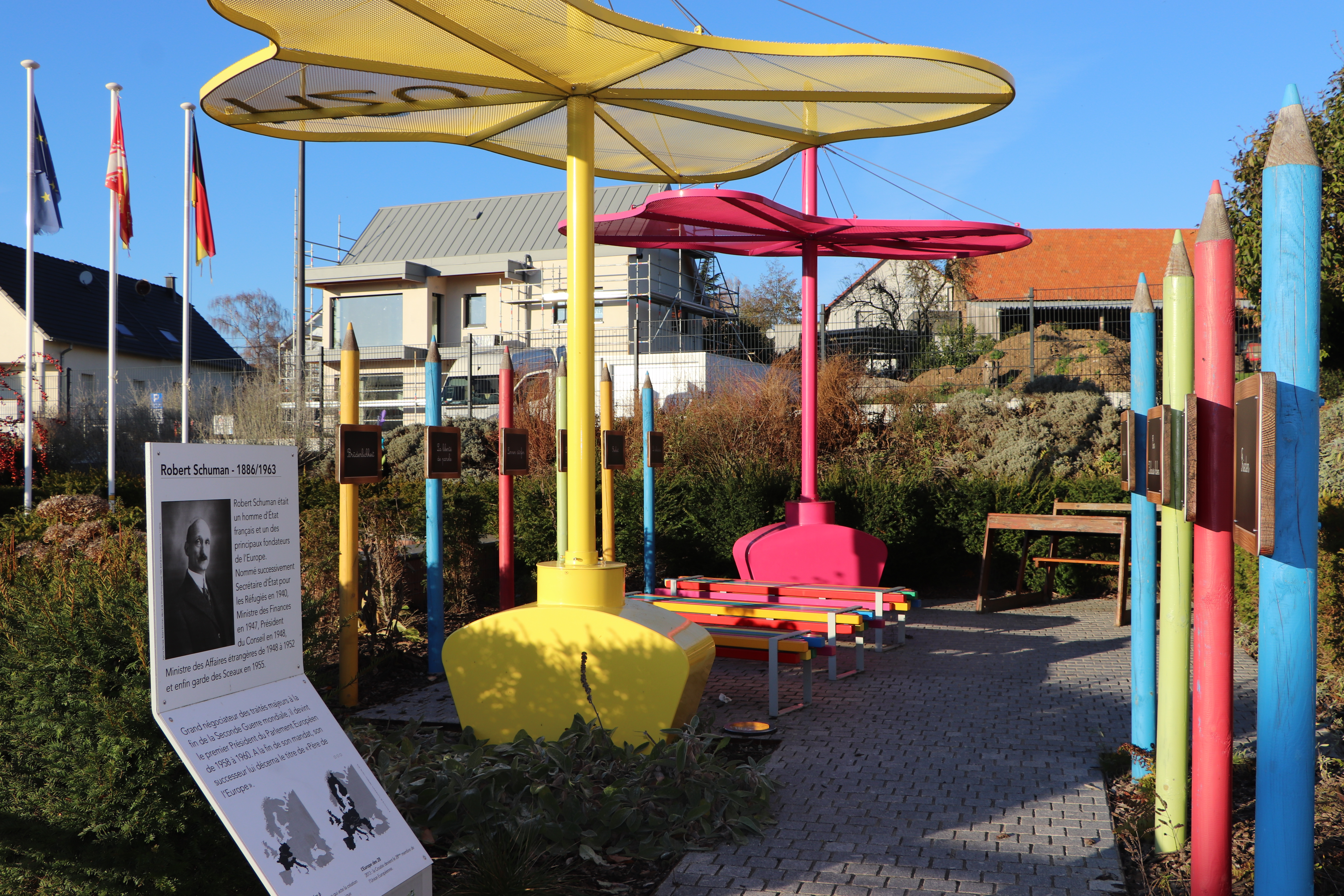 Le Jardin des droits de l’Homme, jouxtant l’école élémentaire, rue du Feu à Truchtersheim, a été inauguré en 2017. Il est le fruit d’une réflexion, lancée en 2014, en partenariat avec l’association Regards d’enfants, qui œuvre pour la connaissance et le respect des droits de l’Homme. L’équipe enseignante a immédiatement adhéré à ce projet fédérateur qui met en avant des valeurs chères à l’enseignement : respect mutuel, sens du travail et de l’engagement, honnêteté vis à vis des autres, comme de soi-même. Dans le cadre du bilinguisme de l’école, le choix d’une ouverture européenne s’est rapidement imposé comme une évidence dans le cadre du jumelage de Truchtersheim avec la commune allemande de Welchensteinach. Cette coopération s’est traduite par la création de diverses sculptures en bois en provenance de cette dernière.